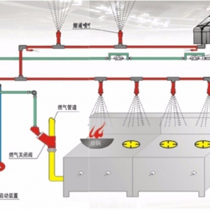 ◆ 当厨房设备发生货品时,燃烧的火焰产生的巨大的热量使烟罩内的温度升高至183℃时感温器断开,将灭  火装置内的机械控制阀打开。